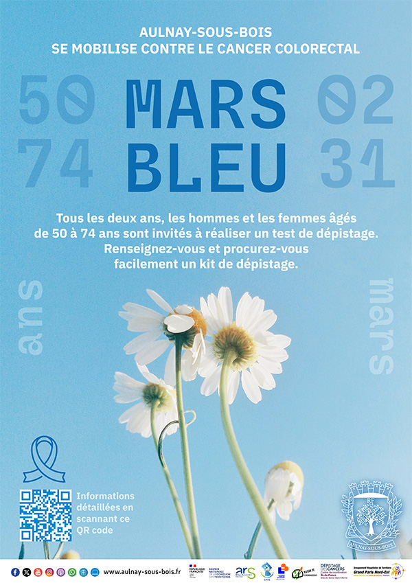 Vous êtes ici : Accueil > Actualités > Mars bleu 2026 Mars bleu 2026 Publié le mercredi 18 février 2026 Aulnay-Sous-Bois se mobilise contre le cancer colorectal Tous les deux ans, les hommes et les femmes âgés de 50 à 74 ans sont invités à réaliser un test de dépistage Des expositions sur le dépistage organisé du cancer du côlon avec information et sensibilisation sont installées du 02 au 31 Mars 2026 : CMES Louis Pasteur -8/10, avenue Coullemont CMS Balagny - rue du Limousin Des stands d’information, de sensibilisation au dépistage et des animations sont proposés : Mercredi 4 mars de 10h à 17h30 Centre Commercial O’Parinor – 1er étage Mardi 24 mars de 10h à 16h Hôpital Robert Ballanger Jeudi 26 mars de 9h à 12h30 Marché de la gare Vendredi 27 mars de 9h à 12h30 Marché de la Rose des Vents Vous pouvez vous procurer le test de dépistage par la méthode de votre choix : le retirer auprès de votre pharmacien, médecin (généraliste, gynécologue, gastro-entérologue) à l’occasion d’une consultation, le commander en ligne sur le site ou vous adresser à votre CPAM (sur votre espace Ameli ou par téléphone au 36 46). Dépistage sur invitation par courrier : Le test est gratuit simple et efficace, il est à faire chez soi. Plus d’informations auprès de votre médecin traitant, pharmacien et au CMES Louis Pasteur Adresse CMES : 8-10 avenue Coullemont Tel. : 01 48 79 41 20 ou 01 48 79 65 32 Défi connecté - Du 10 au 31 mars 2026 Bougeons pour notre côlon Réalisez le plus grand nombre de kilomètres à pied, seul ou en équipe. Défi sportif connecté sur l'application kiplin, avec le code CRCDCMARSBLEU. Utiliser le Tag " Aunay93" Gratuit et ouvert à tous >> Retrouvez les consignes du défi sportif Partager Partager sur FacebookPartager sur TwitterPartager sur Google+ImprimerEnvoyer à un ami Retour à la liste
