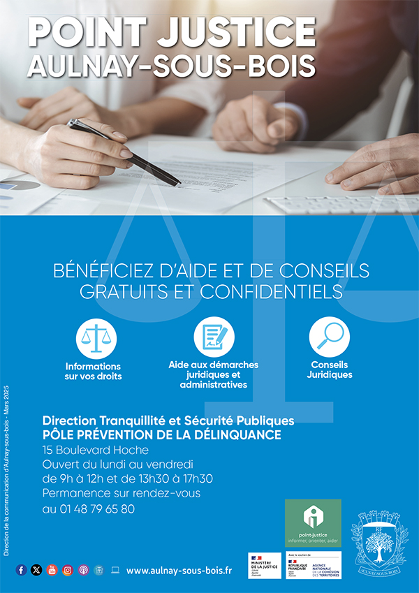 Vous êtes ici : Accueil > Actualités > Point Justice Point Justice Publié le jeudi 01 septembre 2022 La ville d’Aulnay-sous-Bois a mis en place un Point Justice avec le soutien du ministère de la Justice via le Conseil Départemental de l’Accès au Droit (CDAD), et de l’Agence Nationale de la Cohésion des Territoires. Il s’agit d’une information juridique généraliste (tous domaines du droit) : divorce, autorité parentale, plainte avec ou non constitution de partie civile, litiges entre locataires ou avec les bailleurs, litiges salariés et employeurs, droit de la consommation. Ces professionnels assurent un suivi en fonction de leur champ de compétence : Le juriste en droit du logement : • 1er lundi du mois de 9h à 12h et de 13h30 à 16h, • 2ème lundi du mois de 09h à 12h. Le juriste généraliste du CDAD : tous les mardis de 9h à 12h 12h et de 13h30 à 16h30 Le juriste généraliste de la ville : • 2 mercredis par mois de 13h à 17h30, • 2 vendredis par mois de 13h à 17h30, • 1 samedi par mois de 14h à18h. L’avocat : 2 jeudis par mois de 9h à 13h La médiatrice familiale : 3ème lundi du mois de 9h30 à 12h30 Les permanences se tiennent au Point Justice – Pôle Prévention situé au 15 boulevard Hoche. Elles sont gratuites, confidentielles et sur rendez-vous au 01 48 79 65 80. Attention : Pour toute annulation ou demande de report d’un rendez-vous appeler le secrétariat au 01 48 79 65 80 le plus tôt possible afin de positionner une autre personne. >> En savoir plus Direction tranquillité et sécurité publiques – Pôle prévention de la délinquance15, boulevard hocheTél. : 01 48 79 65 80 Voir le plan d'accès Partager Partager sur FacebookPartager sur TwitterPartager sur Google+ImprimerEnvoyer à un ami Retour à la liste