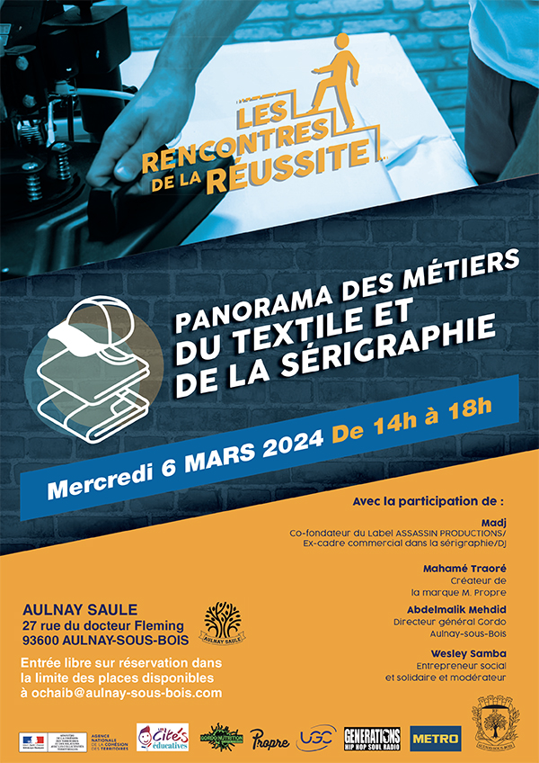 Vous êtes ici : Accueil > Agenda > Évènements > Les Rencontres de la réussite – Les métiers du textile et de la sérigraphie Les Rencontres de la réussite – Les métiers du textile et de la sérigraphie Évènements 06/03/2024 de 14h à 18h Panorama des métiers du textile et de la sérigraphie et de sérigraphie Portées par la direction de l’éducation, les Rencontres de la réussite consistent en des réunions mensuelles destinées à donner de l’information aux 16-25 ans, en lien avec des entreprises locales qui peuvent organiser des entretiens d’embauche sur place. Chaque mois, une nouvelle thématique est abordée. Pour ce mois de juin, les métiers du textile et de la sérigraphie sont à l’honneur. Des professionnels du secteur viendront présenter leur métier et échanger avec les jeunes. Il est conseillé de se munir de son CV ! Réservation auprès d’Omar Chaïb, coordinateur du projet de lutte contre le décrochage scolaire : ochaib@aulnay-sous-bois.com Lors de votre inscription, merci de préciser : votre nom et prénom votre émail votre ville de résidence votre année de naissance Horaires de 14h à 18h Tarifs Entrée libre dans la limite des places disponible Lieu AULNAY SAULE - 27 rue du docteur Fleming Partager Partager sur FacebookPartager sur TwitterPartager sur Google+ImprimerEnvoyer à un ami Retour à la liste Sur le même thème... Voir tout l'agenda Du 02/03/2026 au 31/03/2026 Évènements Mars bleu 2026 Du 08/03/2026 au 31/03/2026 Expositions Exposition essentielles Du 14/03/2026 au 26/03/2026 Environnement Programme Maison de l’Environnement