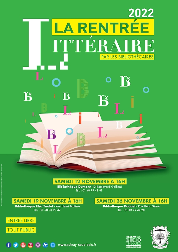 Vous êtes ici : Accueil > Agenda > Loisirs > Culture > Par type > Littérature > La rentrée littéraire 2022 La rentrée littéraire 2022 Littérature Du 12/11/2022 au 26/11/2022 À 16h En ce début d’année, retrouvez la liste des romans coups de cœurs sélectionnés par les bibliothécaires de la Ville. Samedi 12 novembre à 16h Bibliothèque Dumont – 12 Boulevard Gallieni 01 48 79 41 81 Samedi 19 novembre à 16h Bibliothèque Elsa Triolet – Rue Henri Matisse 01 58 03 93 47 Samedi 26 novembre à 16h Bibliothèque Daudet – Rue Henri Simon 01 48 79 44 20 Horaires Le 12, 19 et 26 novembre 2022 à 16h Tarifs Accès libre Horaires Bibliothèques : Dumont, Elsa Triolet, Daudet Partager Partager sur FacebookPartager sur TwitterPartager sur Google+ImprimerEnvoyer à un ami Retour à la liste