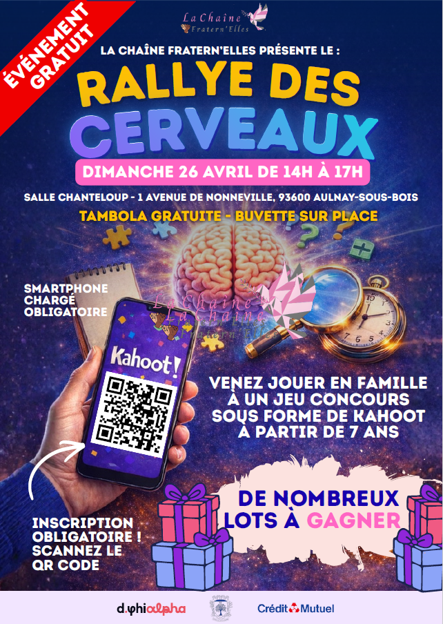 Vous êtes ici : Accueil > Agenda > Loisirs > Vie associative > Rallye des Cerveaux – La Chaîne Fratern’Elles Rallye des Cerveaux – La Chaîne Fratern’Elles Vie associative 26/04/2026 RALLYE DES CERVEAUX – INSCRIPTIONS OUVERTES ! Tu veux passer un super moment en famille ou entre amis ? Rejoins-nous pour un jeu concours fun et plein de défis sous forme de Kahoot ! 🎁 De nombreux lots à gagner 🎟️ Tombola gratuite 🥤 Buvette sur place👉 Inscription obligatoire ici : 🔗 https://form.jotform.com/260754182129357 📱 N’oublie pas ton smartphone chargé 👨👩👧👦 Accessible dès 7 ans – venez nombreux ! On vous attend nombreux pour un moment convivial, fun et plein de surprise Lieu Salle Chanteloup 4 avenue de Nonneville 93600 Aulnay-sous-Bois Tarifs Entrée libre Horaires De 14h00 à 17h00 Partager Partager sur FacebookPartager sur TwitterPartager sur Google+ImprimerEnvoyer à un ami Retour à la liste Sur le même thème... Voir tout l'agenda 22/04/2026 Vie associative Le Gros Saule en Fête 24/04/2026 Vie associative Espace Ethique – APF France Handicap 26/04/2026 Vie associative Rallye des Cerveaux – La Chaîne Fratern’Elles